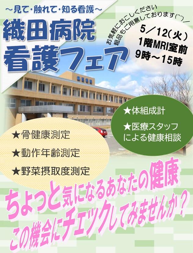 活動情報 2026.04.24 看護フェア開催のお知らせ 令和8年度 看護フェア開催のお知らせ 恒例の看護フェアを開催いたします。 日時:令和8年5月12日 9時~15時 場所:織田病院1階ロビー(MRI室前) ぜひお気軽にお立ち寄りください!
